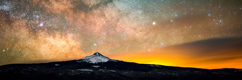Dit is foto uit 'scape magazine #2. We zien hier het Miramonte Reservoir in Colorado, VS en kijken naar de kern van het Melkwegstelsel terwijl het oprijst boven Lone Cone Mountain. Het geel in de wolken rechts op de foto is lichtvervuiling van een nabijgelegen stadje. Foto: Bettymaya Foott